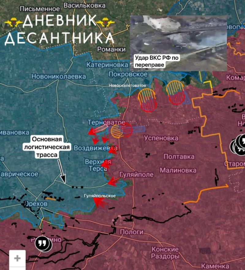 В районе НОВОСКЕЛЕТОВАТОГО ВСУ задействовали насыпную переправу и мост для переброски резервов к линии фронта, авиация ВС РФ точным ударом разрушила путепровод.