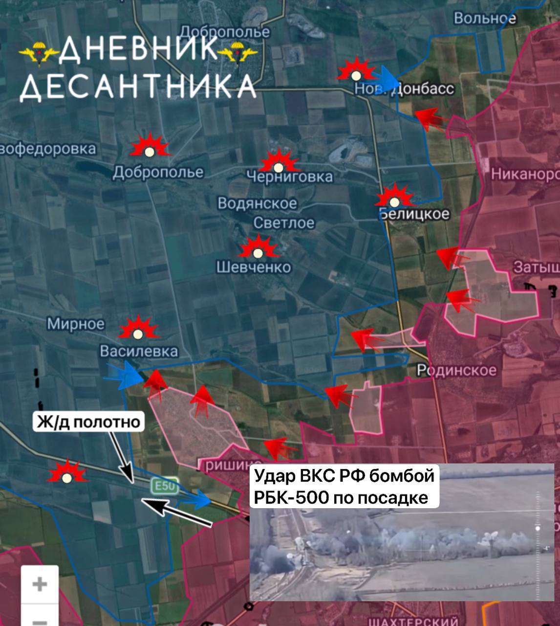 ВКС РФ наносят удары по позициям противника авиабомбами РБК-500, которые способны уничтожить и наносить максимальный ущерб личному составу вражеских войск. Тем самым пресекая контратаки и уничтожая пункты управления БПЛА. ВСУ оборудовали позиции преимущественно вдоль ж/д путей на СЕРГЕЕВКУ.