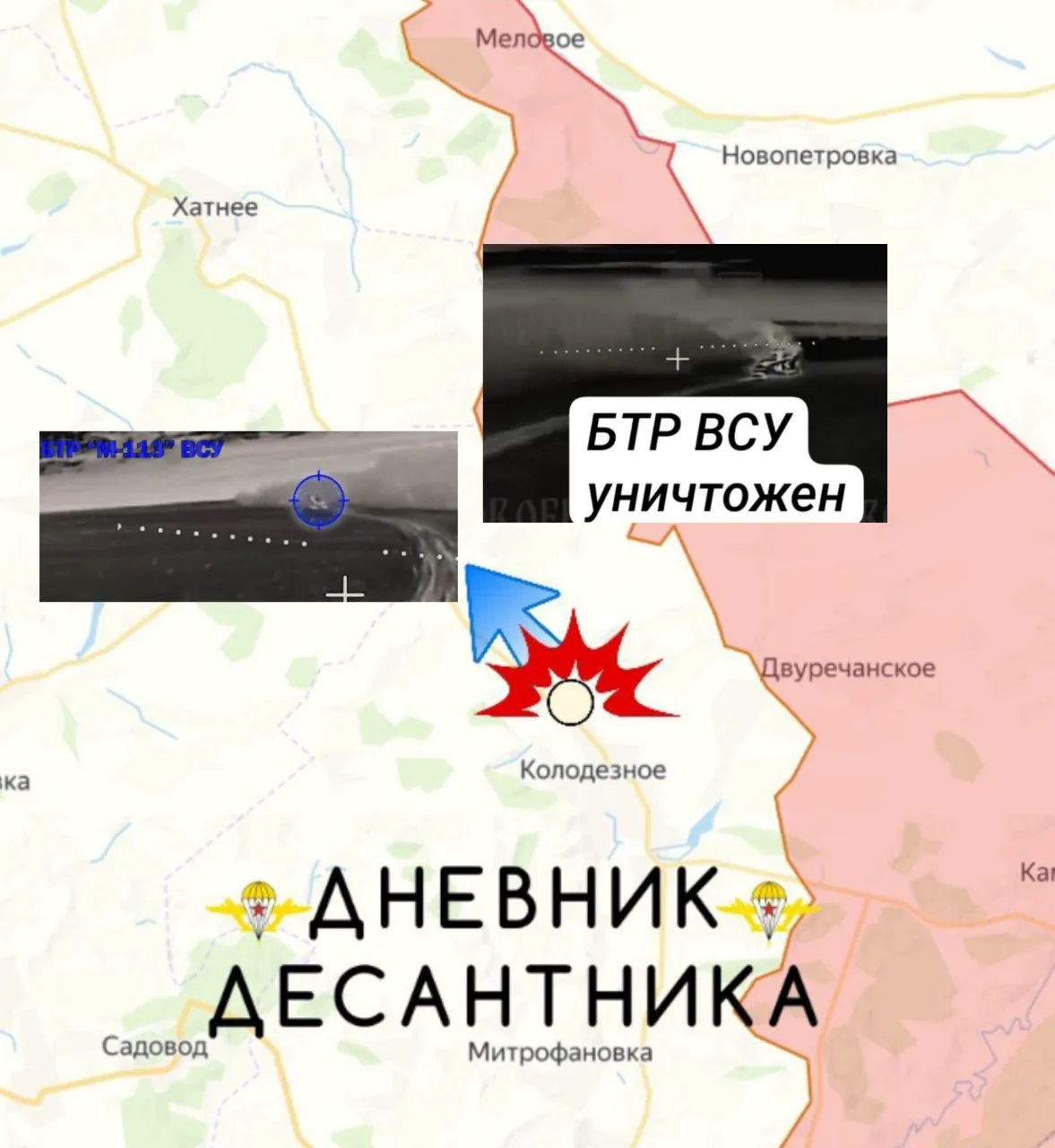 Вражеская бронетехника следовала в сторону населённого пункта ХАТНЕЕ, но наша разведка обнаружила БТР М-113 в районе населённого пункта КОЛОДЕЗНОЕ, а наши операторы БПЛА уничтожили бронетехнику врага.