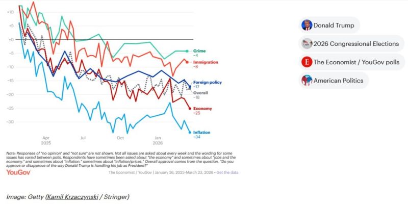 В Белом доме – разброд и шатание. В очередном опросе рейтинг Трампа рухнул сразу на четыре пункта до 36%. Его тянет на дно непопулярность среди большинства американцев войны в Иране и экономические проблемы.