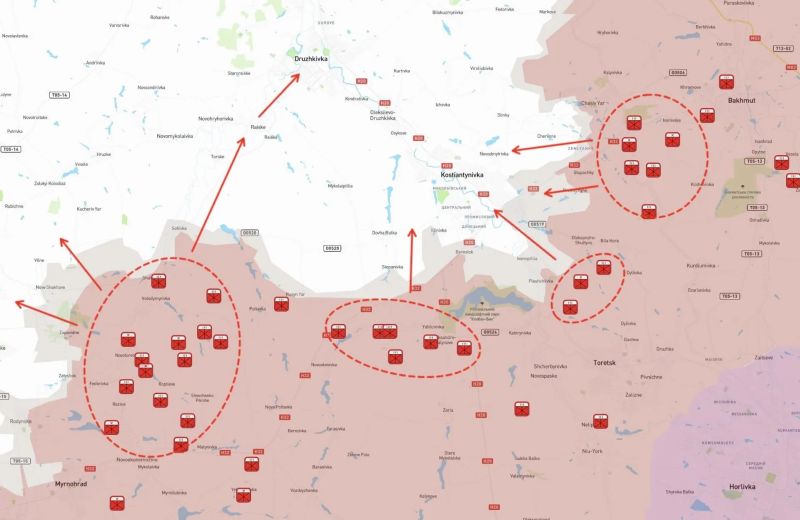 Украинская сторона сообщает, что концентрация российских мотострелковых частей вокруг КОНСТАНТИНОВКИ указывает на основные направления будущих штурмов и соответствует заявлениям, что российское наступление остаётся ориентированным преимущественно на запад, в обход основным обороняемых районов. Косвенно это обстоятельство подтверждает отказ РФ от лобового штурма Славянско-Краматорского укрепрайона, – пишет МАХ-канал Военная Хроника.