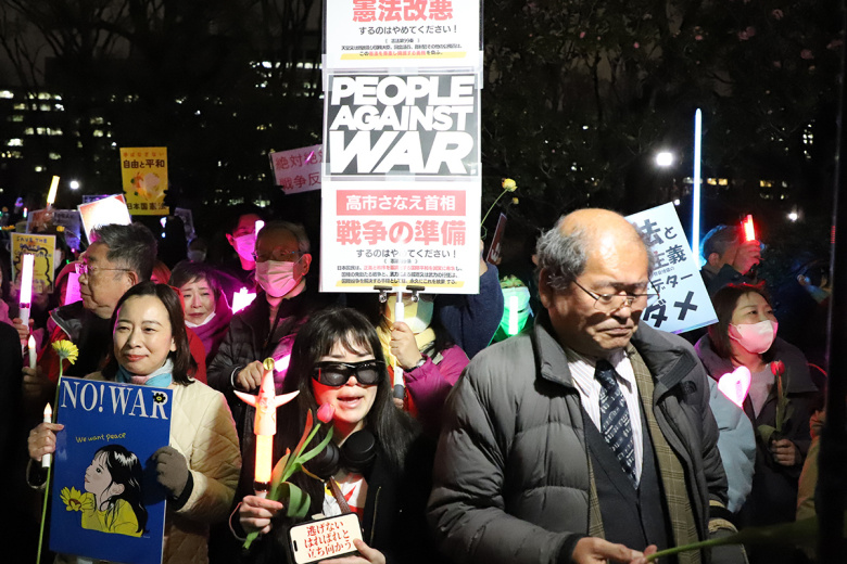 Другой участник митинга сказал, что боится войны и обеспокоен настойчивыми попытками правящей ЛДП внести поправки в 9-ю статью. Он выразил надежду, что Санаэ Такаити уйдет в отставку и ей на смену придет руководство, способное развивать подлинную демократию, а Япония сохранит дружественные отношения с Китаем и другими странами мира.