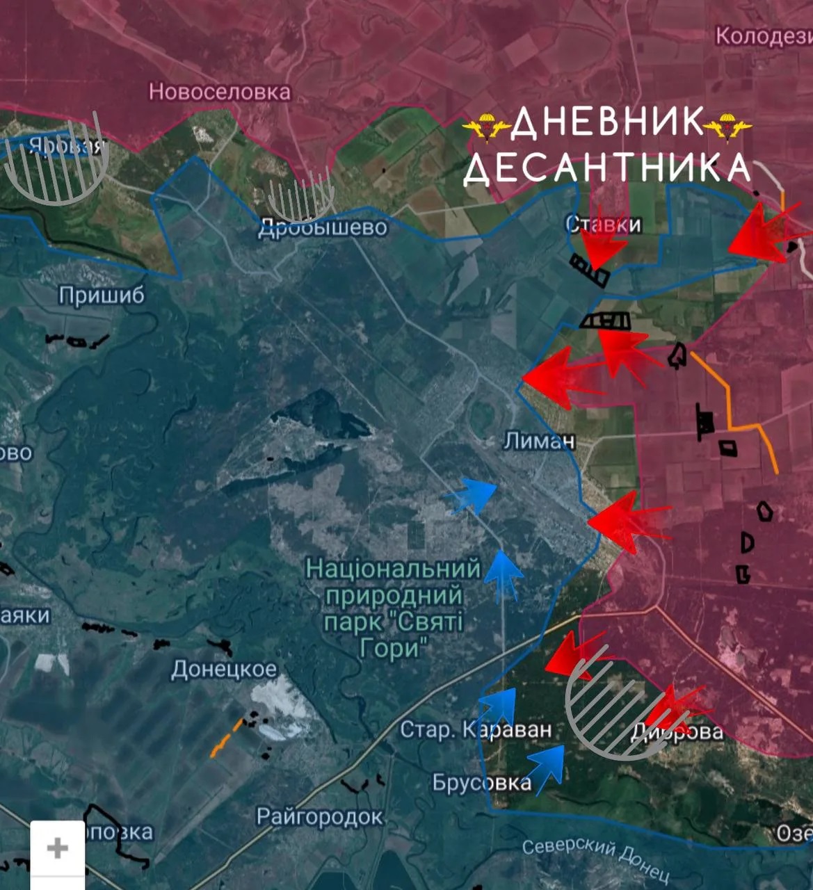 Южнее, наши войска наступают от ДИБРОВОЙ к БРУСОВКЕ и СТАРОМУ КАРАВАНУ, вклинивание в оборону противника идёт малыми группами, также, как и ВСУ, используя плавсредства пытаются перебросить резервы для переброски к югу КРАСНОГО ЛИМАНА.
