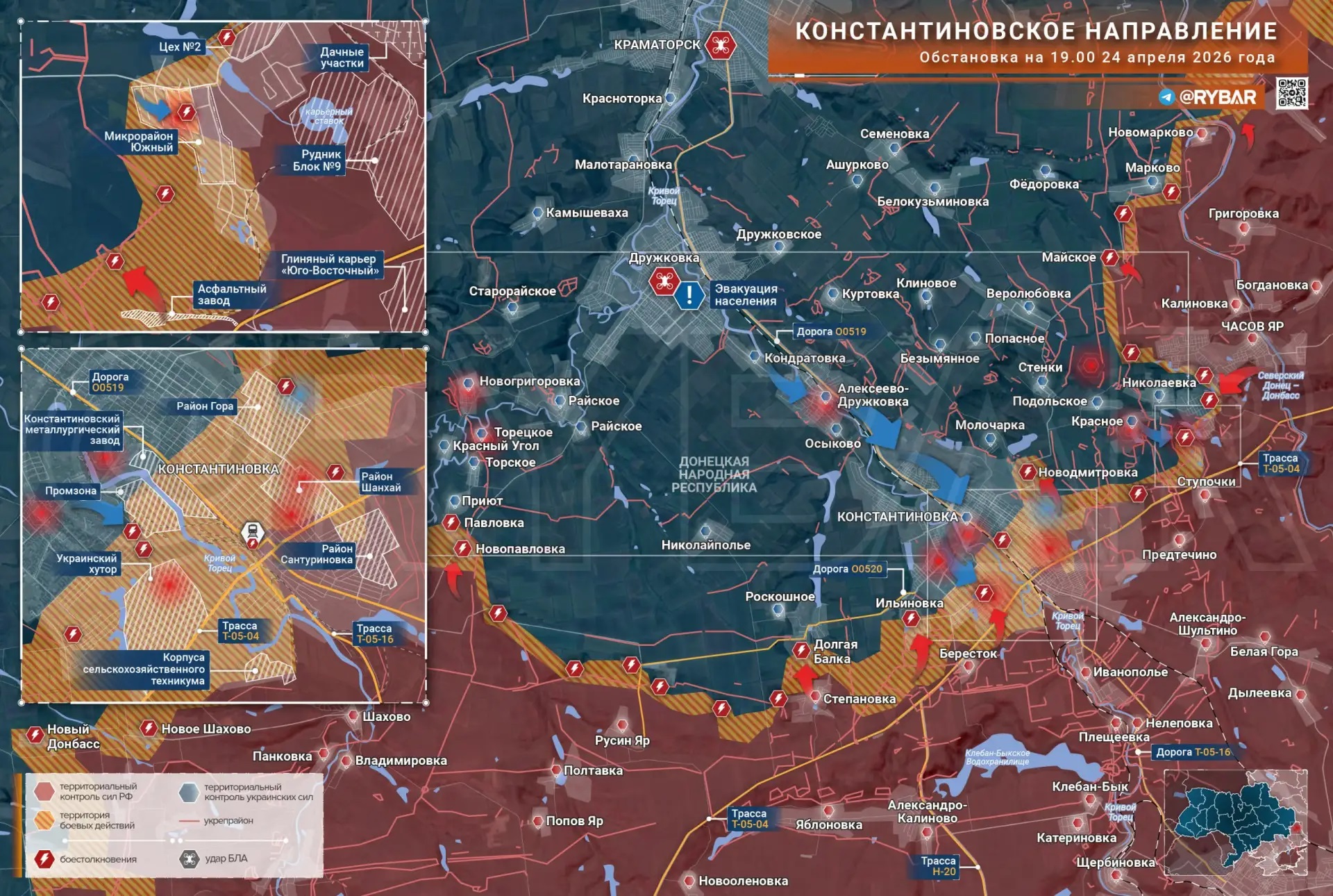 Западнее города столкновения идут на рубеже ИЛЬИНОВКА – ДОЛГАЯ БАЛКА, сведений об изменении конфигурации фронта на этом участке на текущий момент нет. От одновременных успехов на обоих флангах города будет зависеть дальнейший характер боев за КОНСТАНТИНОВКУ.